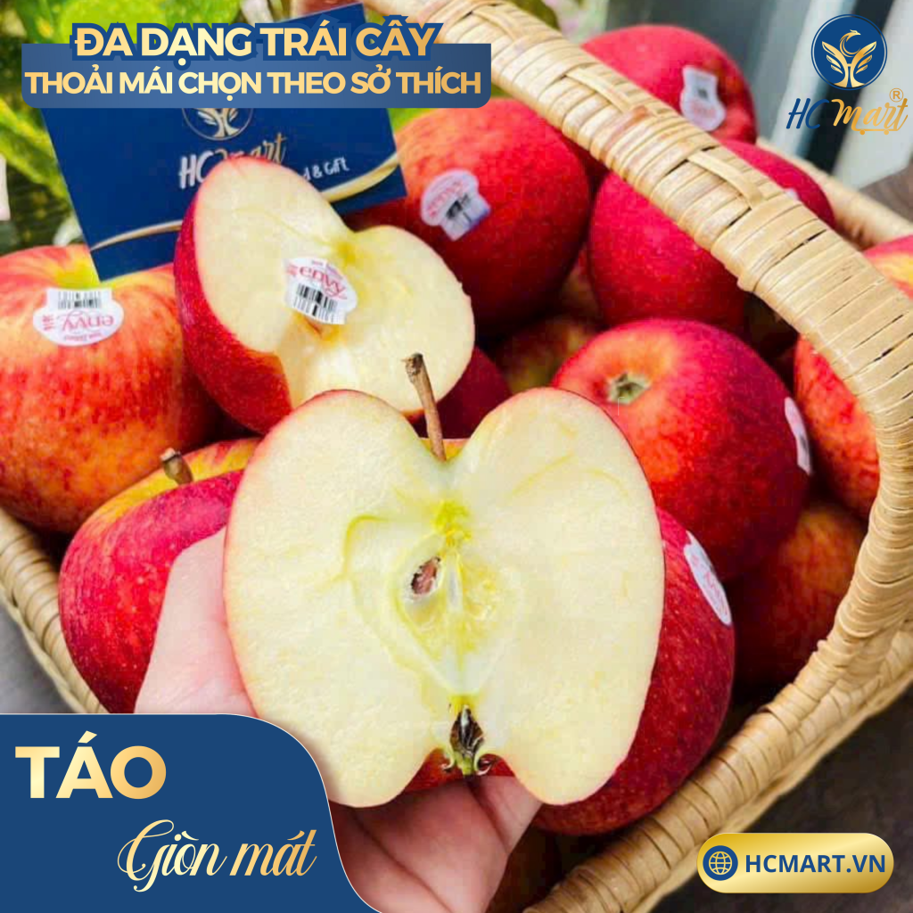 Táo tại HC Mart có độ giòn cao, vị ngọt dịu, bảo quản tốt, phù hợp cho cả người lớn tuổi và trẻ em.
