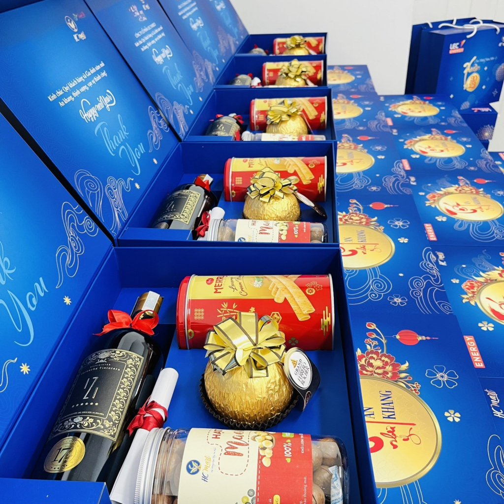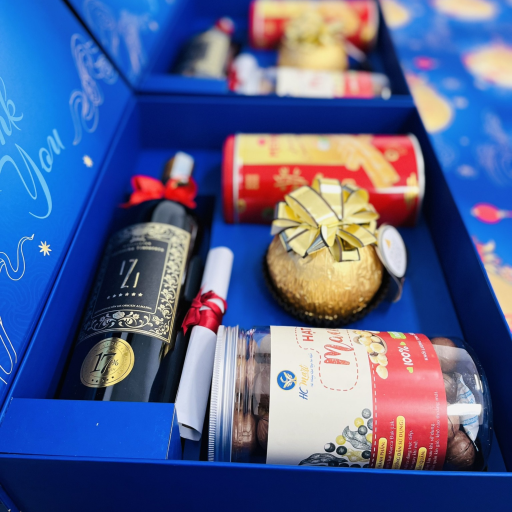 Mỗi hộp được lựa chọn kỹ, bao gồm trái cây nhập khẩu, hạt cao cấp, bánh quy, trà – rượu… phù hợp cho mọi độ tuổi nhân sự.