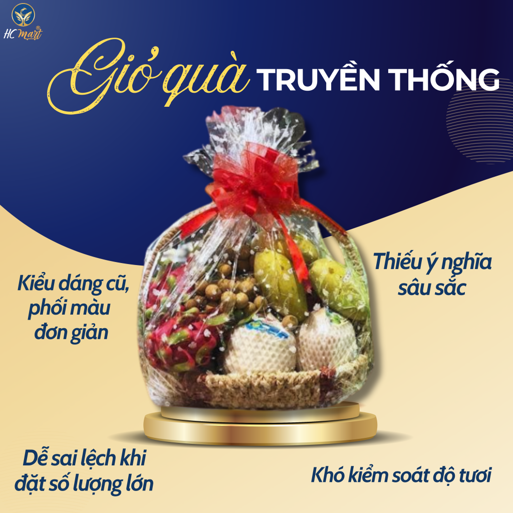 - Giỏ quà truyền thống: thường chọn trái cây từ nhiều nguồn khác nhau, khó kiểm soát độ tươi và nguồn gốc.